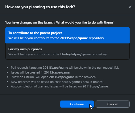 You should finally come to a screen that looks like this, go ahead and keep the selection "To contribute to the parent project" active and click continue. Congratulations, you just finished forking and cloning the game server!