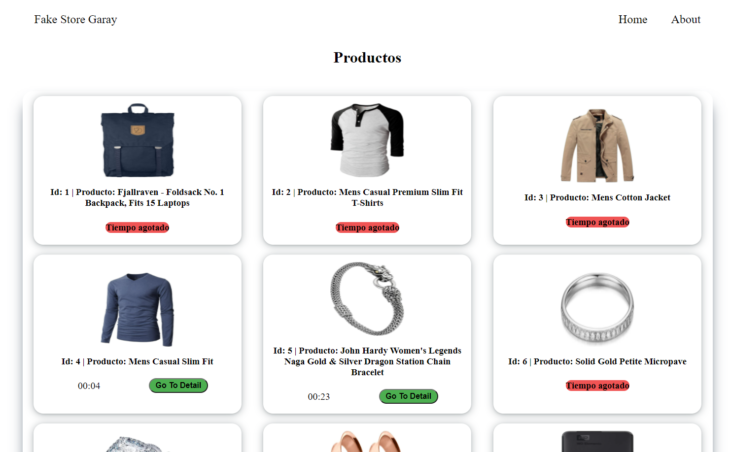 This project was our first assesment from Make It Real bootcamp. The goal that we needed to achieve was to render products using fake store api, adding a random timer to each displayed product, then after the timer is complete, make the product deatil button unavailable.