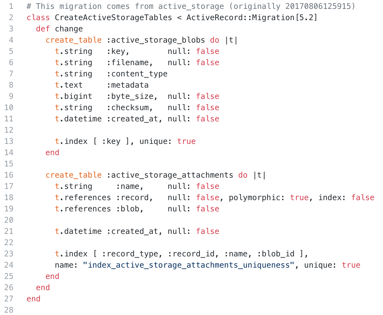 rails active_storage:installin your terminal - This will generate a migration that adds two tables to your database: