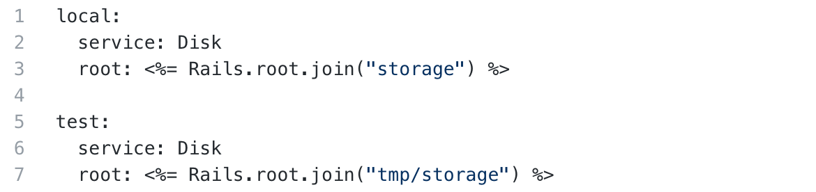 config/storage.ymlIf you’re building a development or test app, or you just want to practice using Ruby and Rails, built-in disk storage is probably enough. To use disk storage, your storage.yml file should have this code: