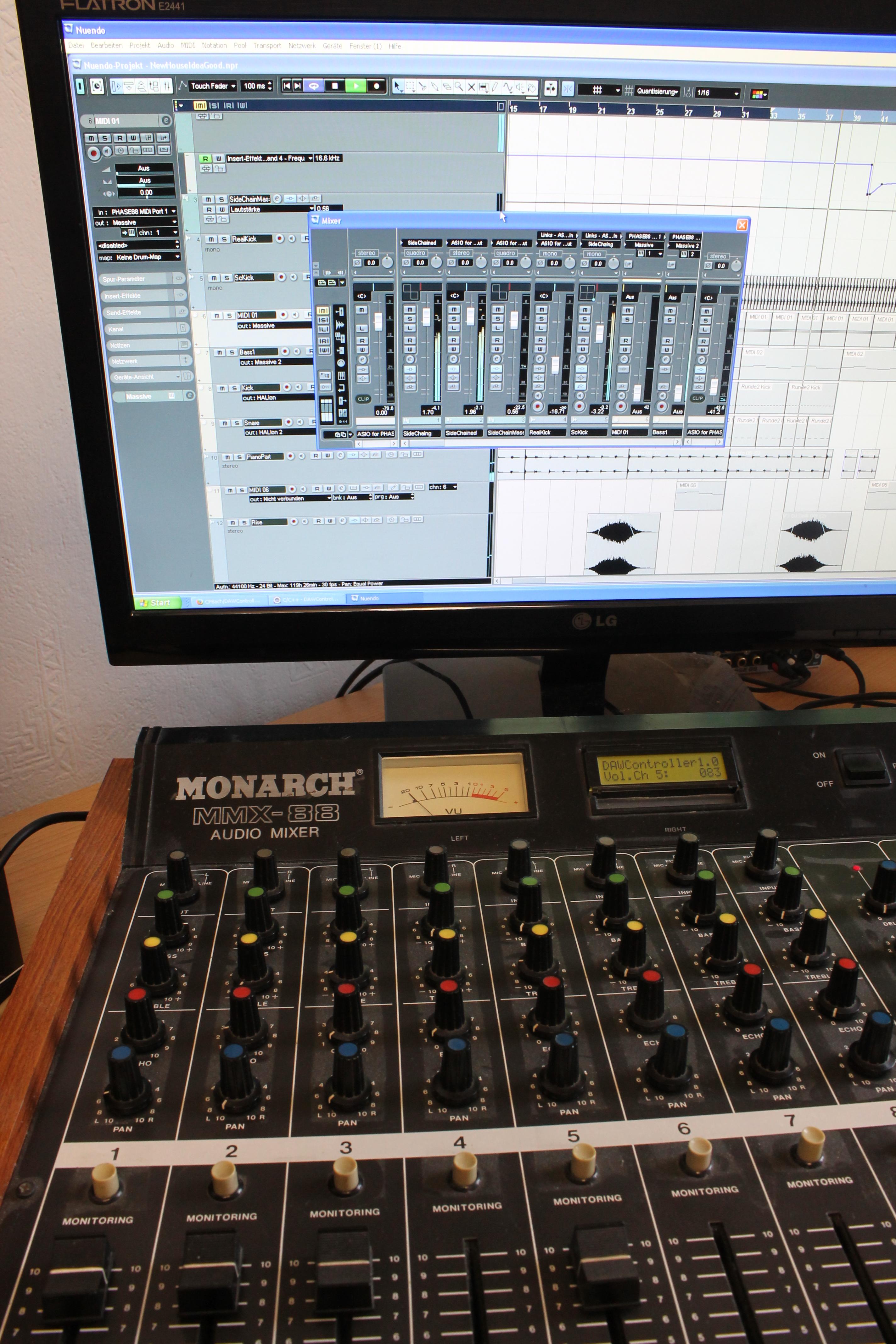 DAWController is a project started two years ago with the goal to provide a software framework for AVR-microcontrollers to be able to use old analog controllers and turn them into MIDI-controllers. This is done by using the AVR's intern AD-converter to discretize voltage on the resistors and then turning it into MIDI-messages. To be able to measure a large amount of resistors, we use Multiplexer-ICs. Every knob/slider/switch is configurable with a custom MIDI-message-number.