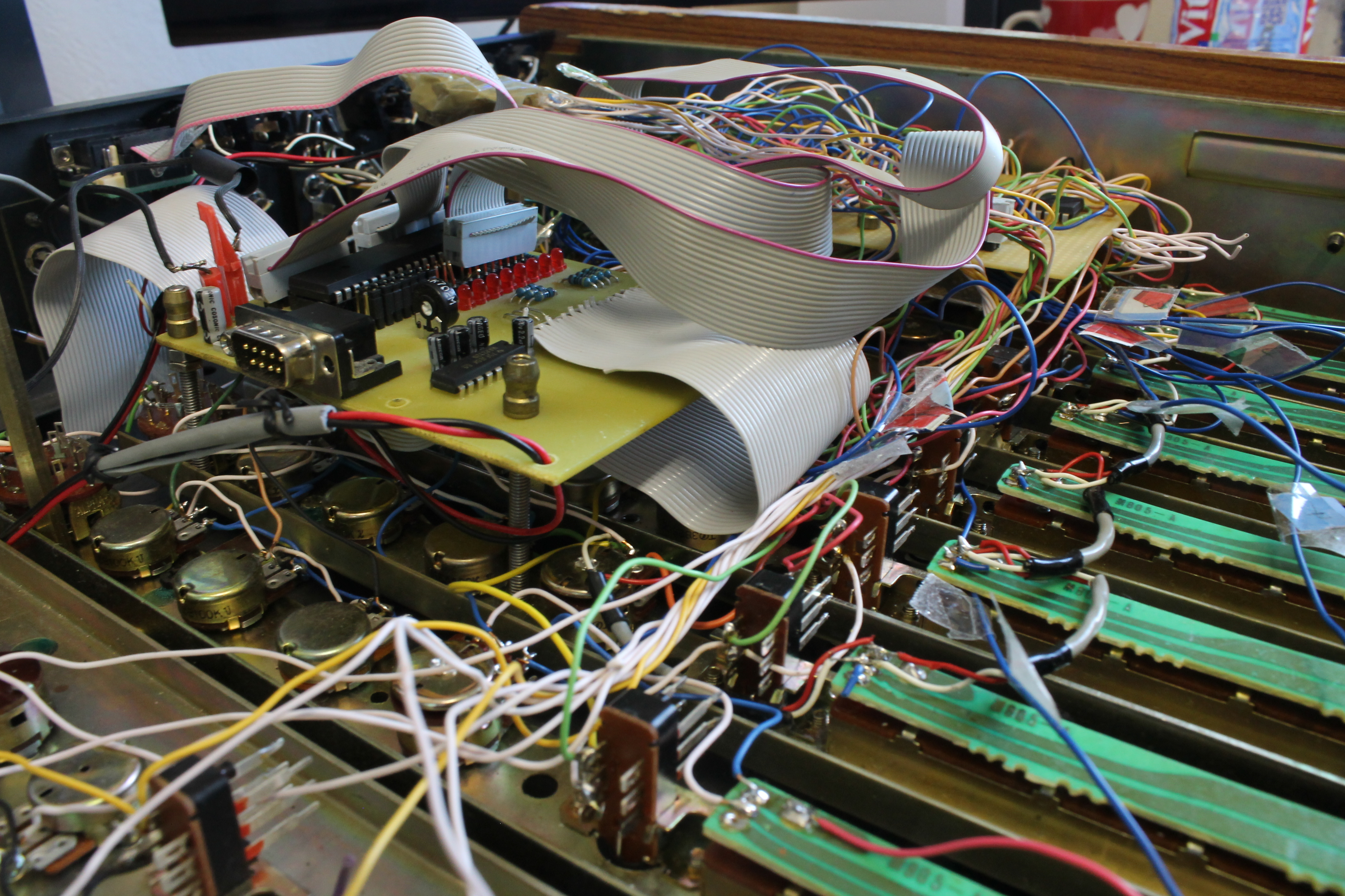 We simply turned one Mic-In into a DC-IN, another MIC-In into a MIDI-OUT and a MIC-in into serial programmable interface. This is how the mixer looks from the inside. Quite a mess.