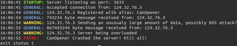 serverlog.Fatal(conn.IP, "crashed the server! Kill all") // This will terminate the program with an exit code of 1