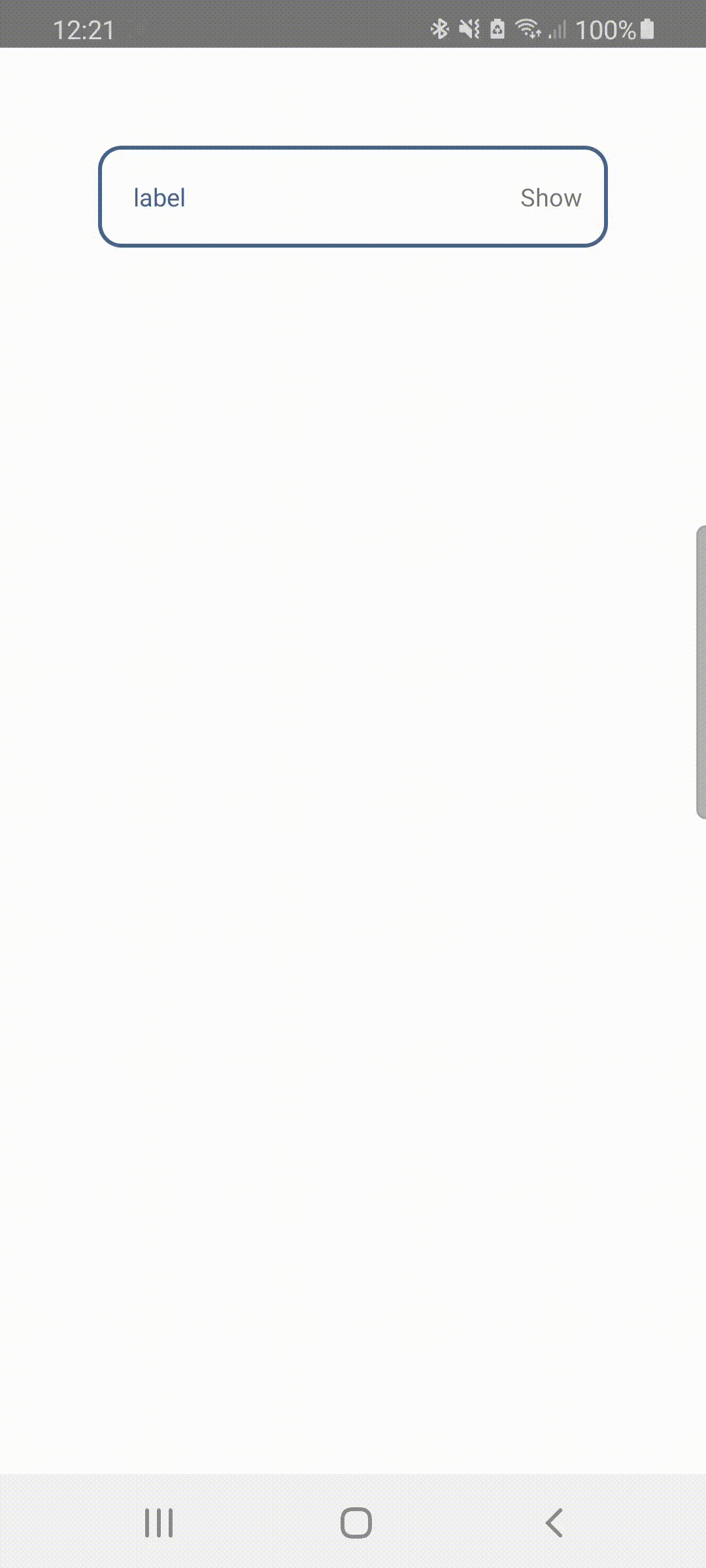 });- Set this to true if you want the label to be always at a set position. Commonly used with hint for displaying both label and hint for your input. For changing the position of the label with this prop as true, use the customLabelStyles topFocused and leftFocused to adjust the wanted position. Default false.