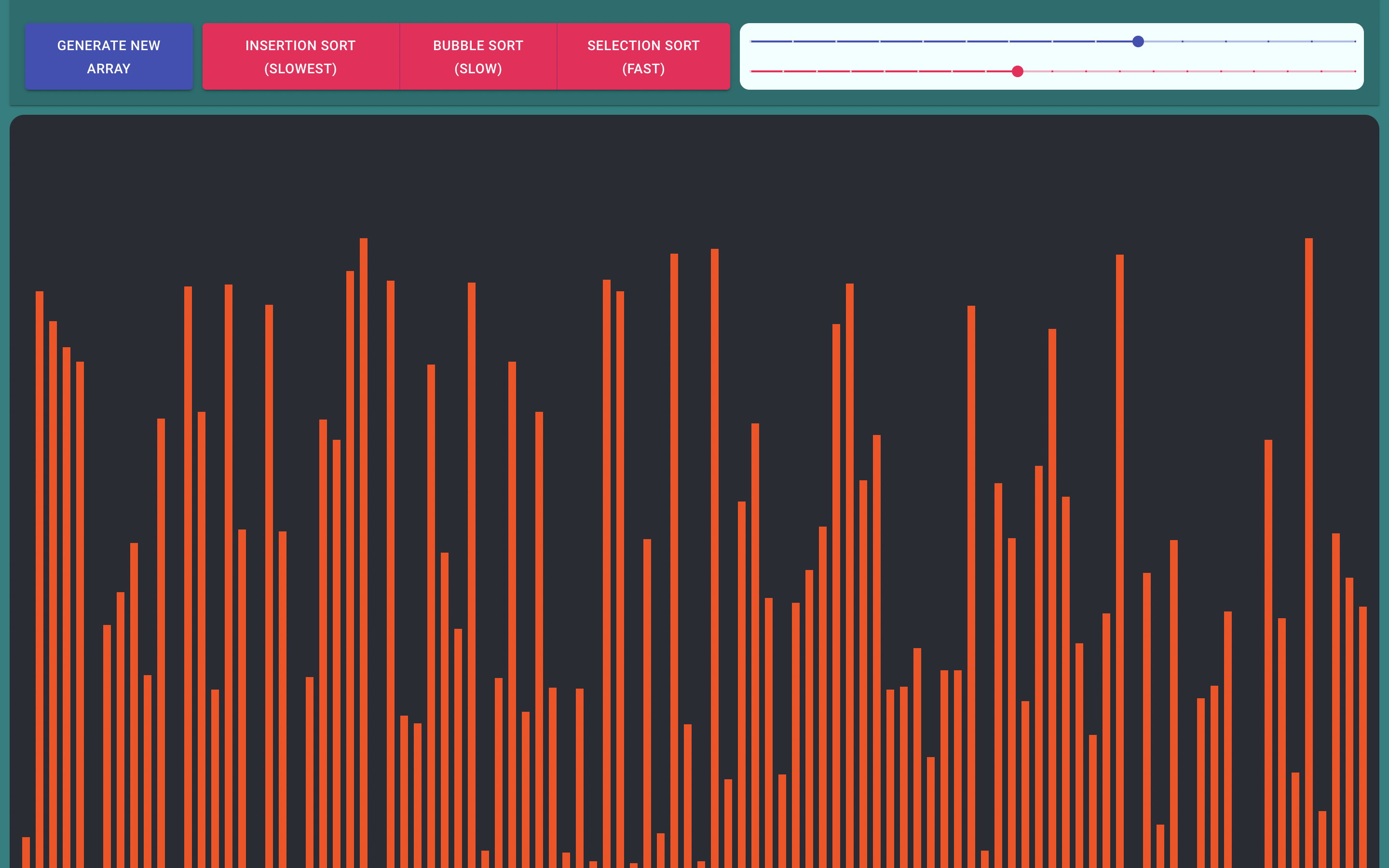 Generate an array and visualize three different sorting algorithms in real time. Use the sliders in the controls to adjust array size and sorting speed. Made with React and Material UI.