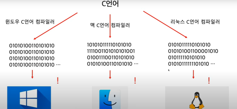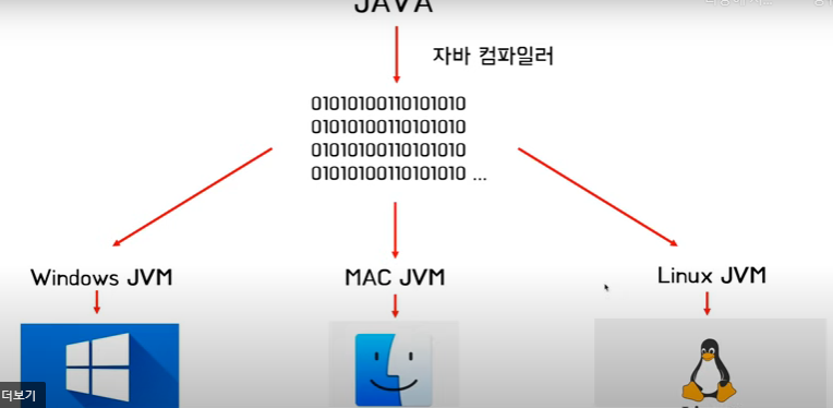 - 원래는 OS마다 다른 컴파일러가 필요하지만, JAVA는 JVM과 0과 1을 OS에 맞게 번역해준다.