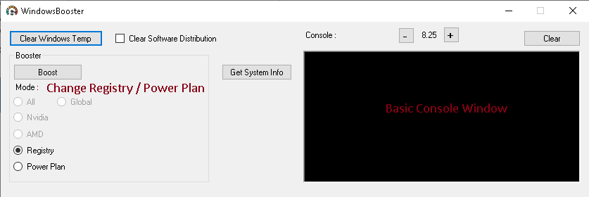 WindowsBooster (Unfinished) This will only work for Lastest Windows 10 (i think 21H2) Credits : https://youtu.be/W-LnnjsCAe8 https://youtu.be/SaYbFmB2rDw https://youtu.be/MUZ1jpnr71w Layout : Features : Clear Windows Temp Set To Highest Performance By Changing Windows Registries One-Click Install Pajno's Ultimate Performance Power Plan source code maybe release idk
