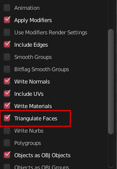 Load the model you want to import into your 3d program (blender, 3ds max, etc). You want to make sure materials or the meshes (optional) are split how you want to map different collision materials to them. This could be things like floors, walls, the effects or sounds they make, etc. After that, export it as a .obj in your 3d program. For exporting, all you need is to have it triangulate. In blender, it is this setting.
