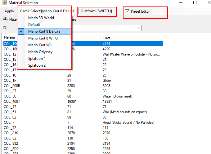 Select your game preset and optionally your platform if you use the default preset instead. You can toggle the preset editor to select different materials supported by the included game presets.