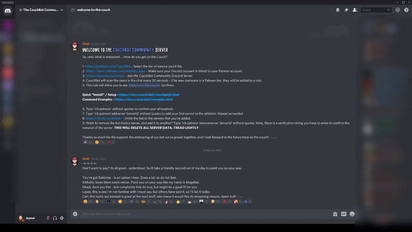 Looking to engage your communities, let your Twitch, and YouTube viewers know when you've got new content, or know when your favorite creators have gone live? Look no further. CouchBot has been running for over 4 years, has gone through a few rewrites, and we're one of the best at doing what we do.