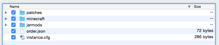 By default, all the instance files are checked however not all of these are required in all minecraft launchers. The following will explain the basics of each file shown above: