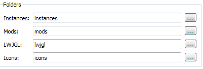 Here you can set the locations for Instances, Mods, LWJGL, & Icons. Please note that all of these folders are used, for example forge is downloaded to the mods folder.