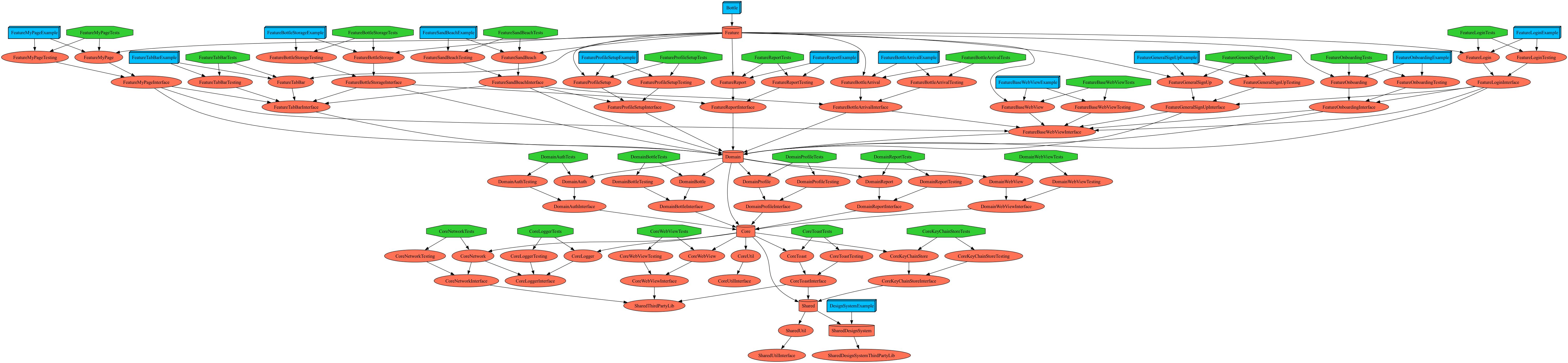 보틀 - 너에게 보내는 편지 편지를 쓰고 답장을 기다리면서, 아날로그 시대의 설렘과 감성을 느껴보세요. 병에 담긴 편지를 물에 띄워 보내보세요. 떠내려온 편지를 통해 느린 소통의 감성을 경험해보세요. Architecture The Composable Architecture (TCA) The Modular Architecture 모듈 계층 구조 Dependencies Graph TechStack SwiftUI TCA Tuist Swift Concurrrency Alamofire Kingfisher Moya Lottie