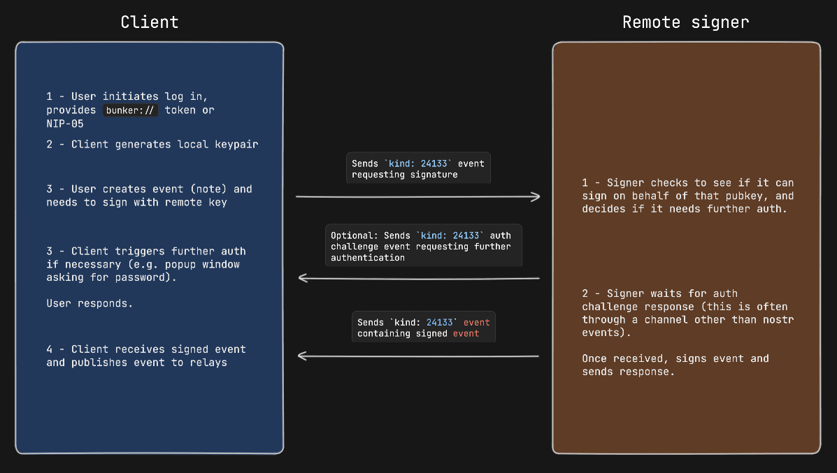 This NIP describes a method for 2-way communication between a remote signer and a Nostr client. The remote signer could be, for example, a hardware device dedicated to signing Nostr events, while the client is a normal Nostr client.