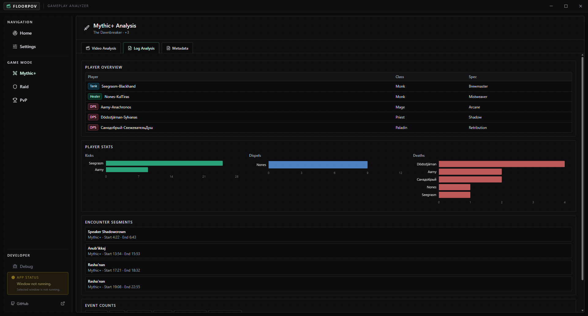 FloorPoV is a desktop application that records your World of Warcraft gameplay while automatically detecting and marking important events like player deaths, boss encounters, kills, and interrupts directly on the video timeline. Perfect for analyzing Mythic+ runs, raid progression, and PvP matches.