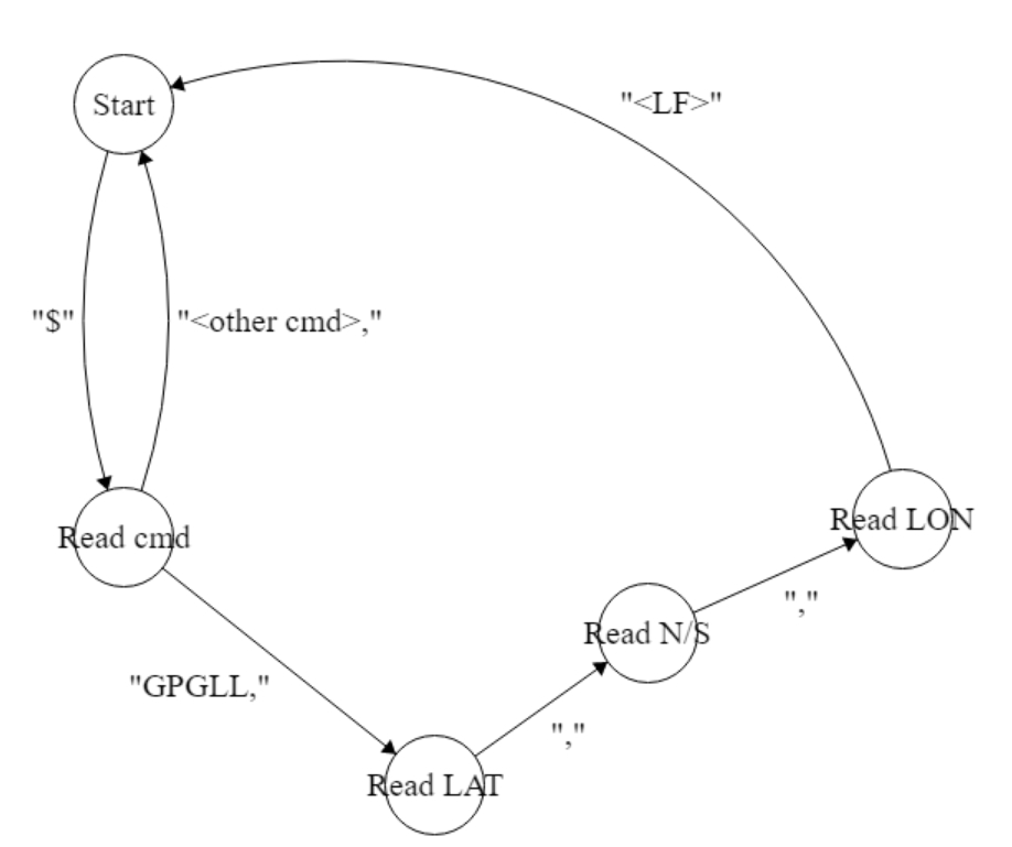 Для обработки сообщений с GPS модуля был разработан простой конечный автомат:
