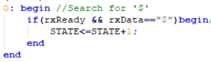 - Стартовое состояние (состояние покоя) – автомат ожидает сигнала от UART модуля, сообщающего что получены данные и по приходу этого сигнала проверяет данные, если пришло "$" – переходит в следующее состояние: