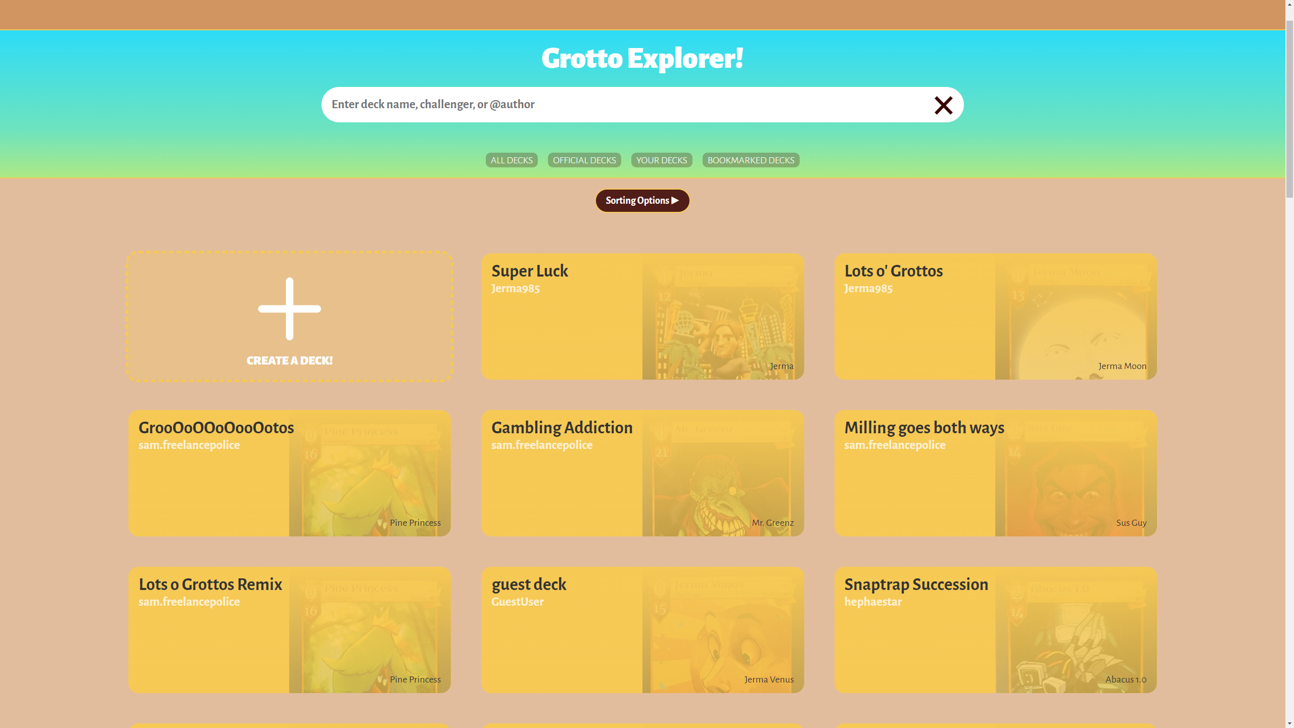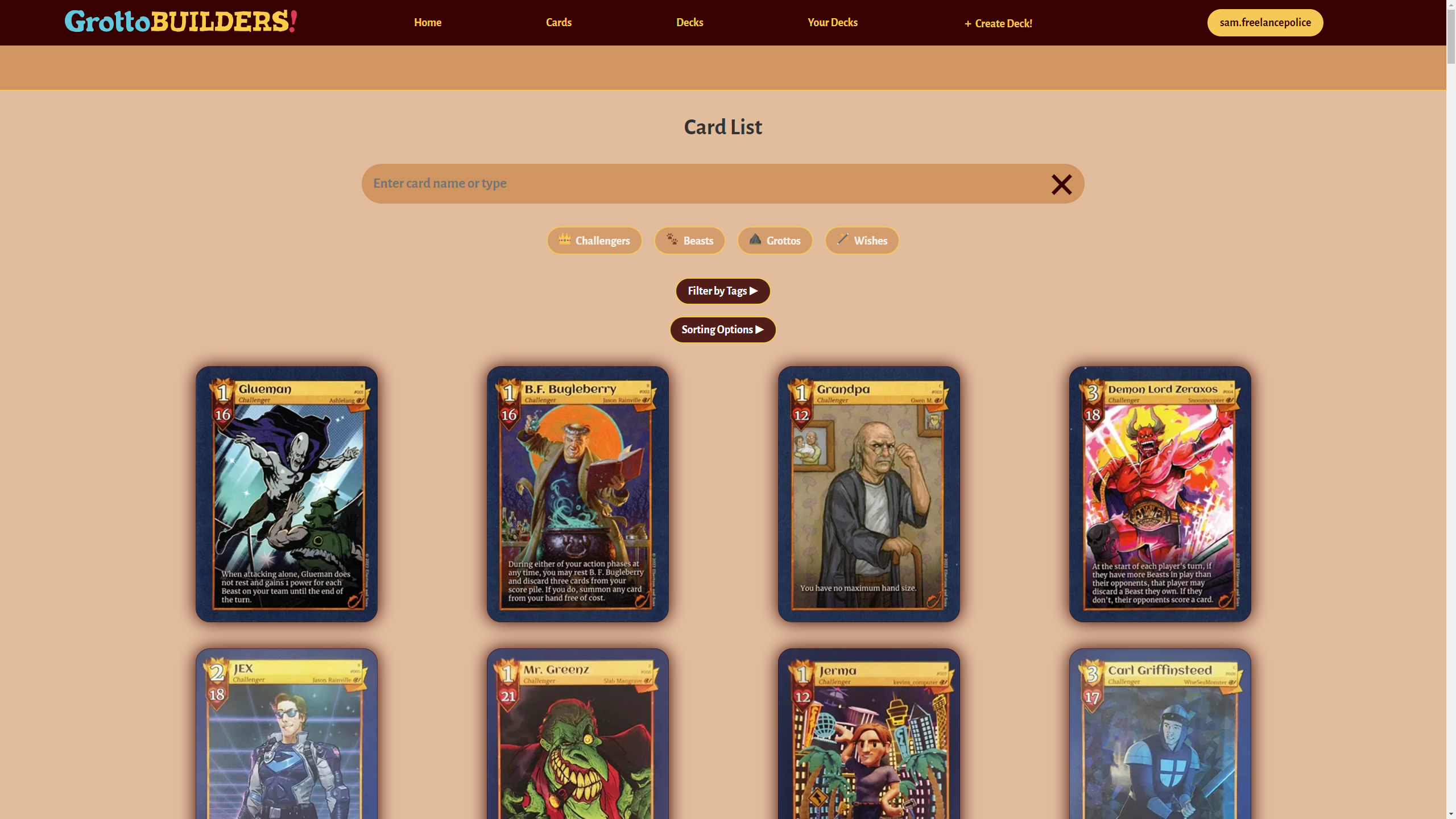 Grotto Builders! is a Deck Building tool for the hit trading card game Grotto Beasts!. Create decks, share them, and explore the decks the community has made.