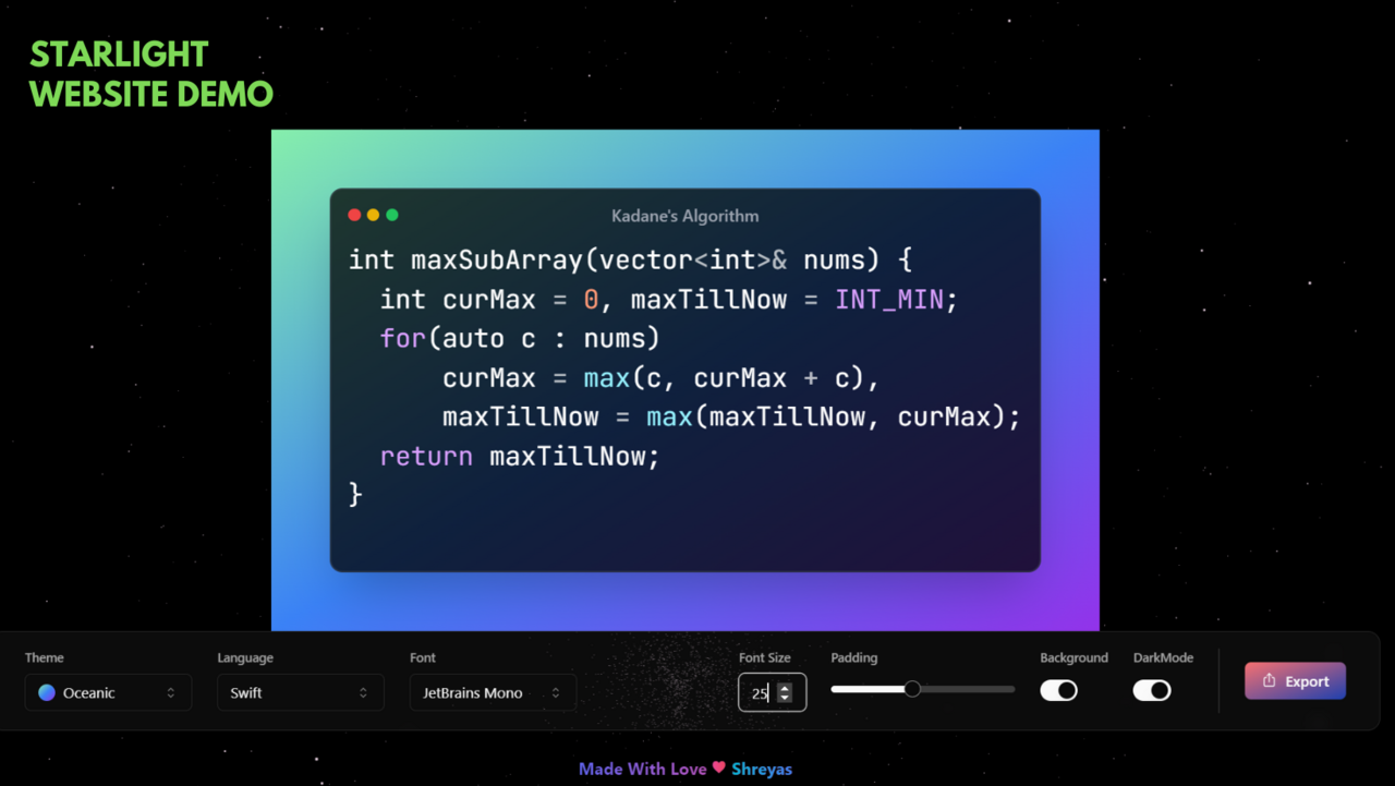 This website simplifies creating visually striking code snippet screenshots for social media sharing with vibrant themes and easy customization. Share your code expertise in style and grab attention effortlessly.