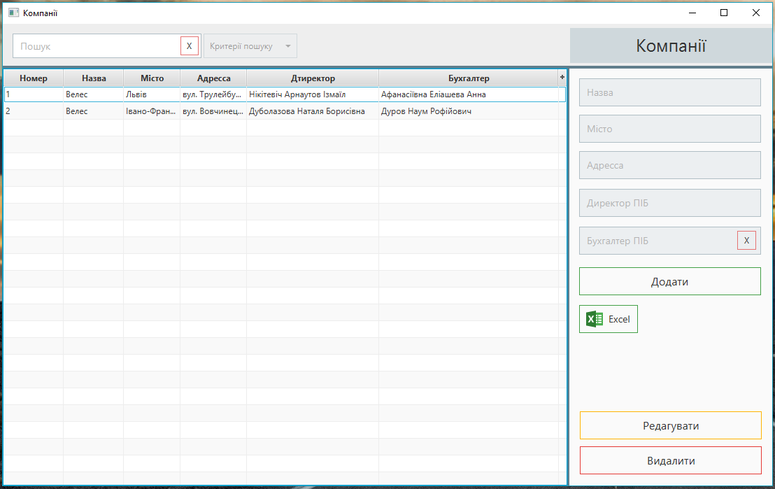 - Add, edit and delete information about employees and equipment: using the main and context menus.
