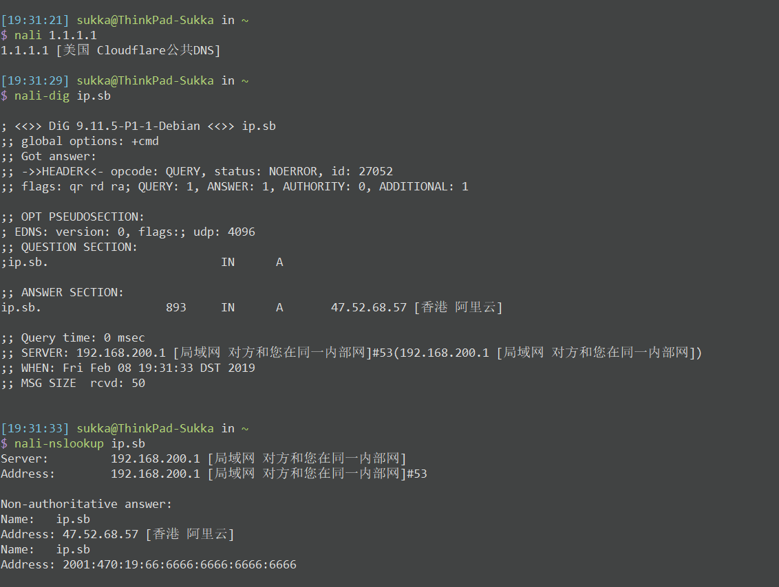 $ [sudo] make installNali required related packages installed. For example, in order to use nali-dig and nali-nslookup you need to have dig (dnsutils) installed.