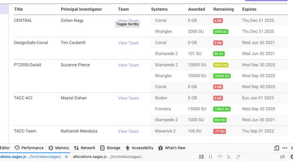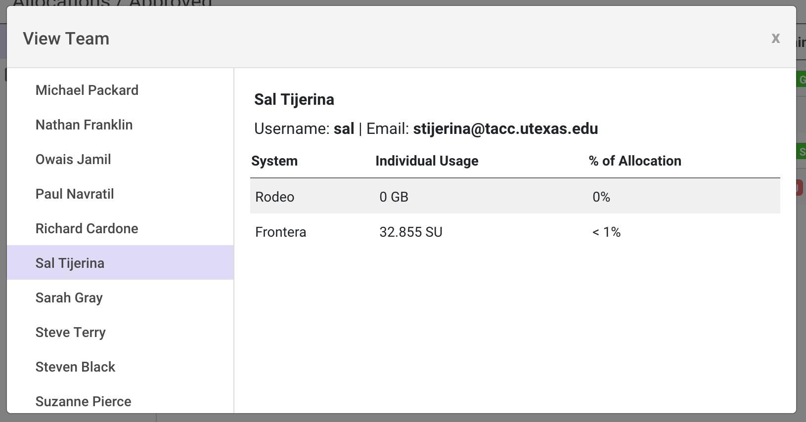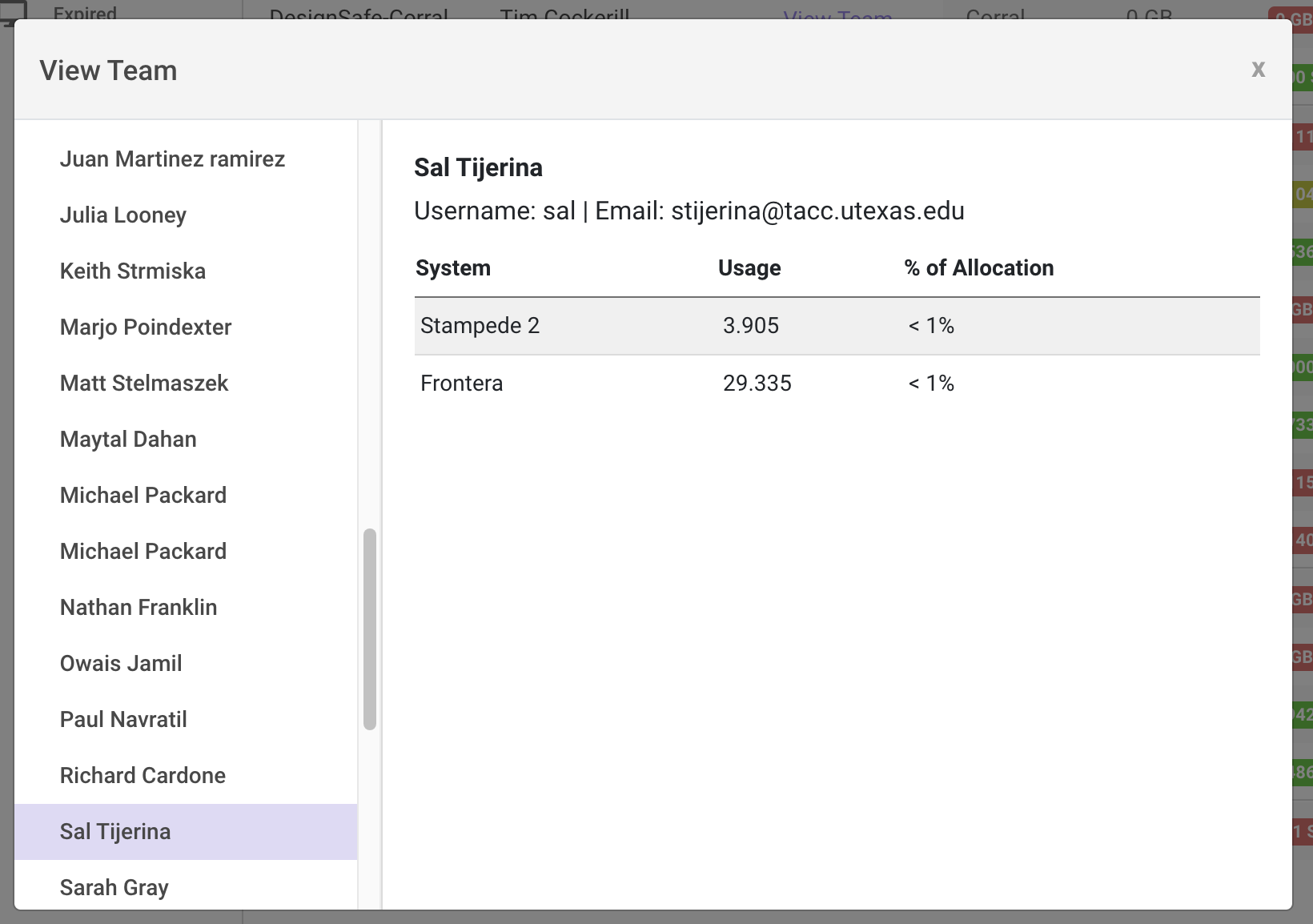 Go to the allocations section and click View Team. Almost every developer in WMA has some usage data in the TACC-ACI project.