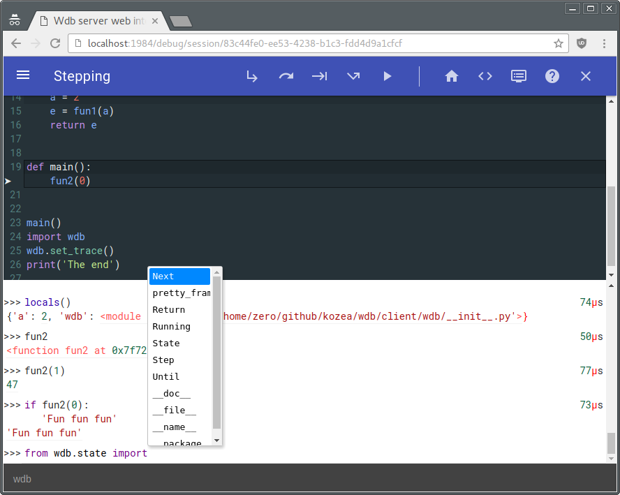 The wdb server which is responsible of managing debugging instances along with browser connections (through websockets) is based on Tornado. The wdb clients allow step by step debugging, in-program python code execution, code edition (based on CodeMirror) setting breakpoints...