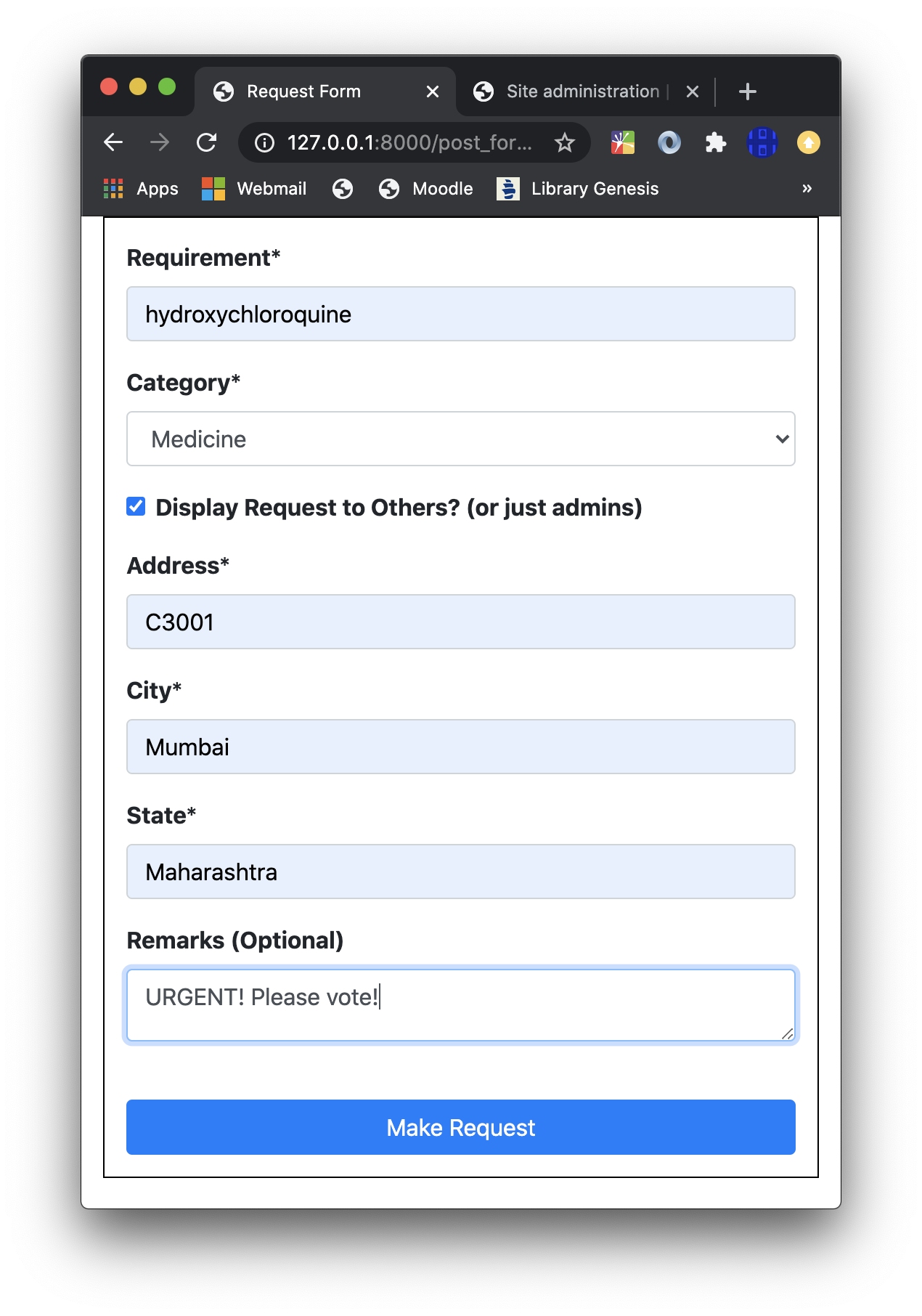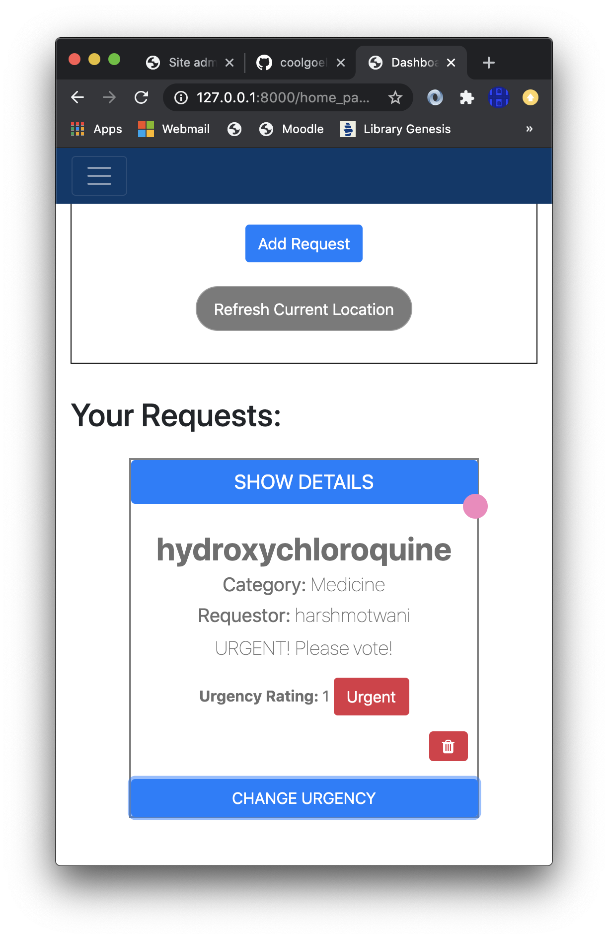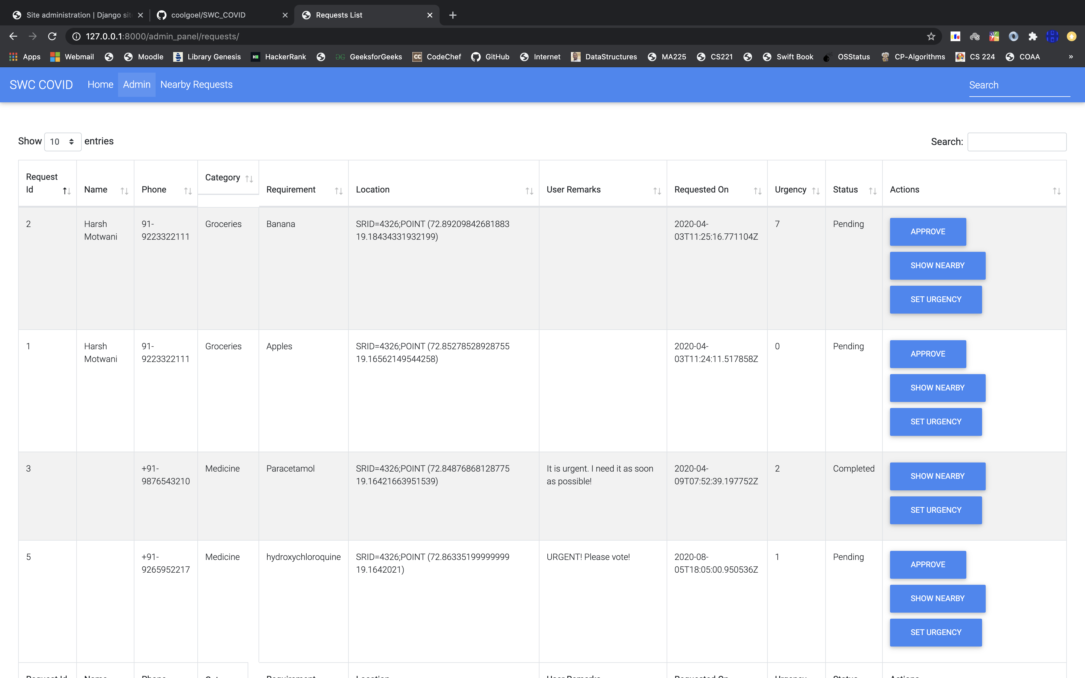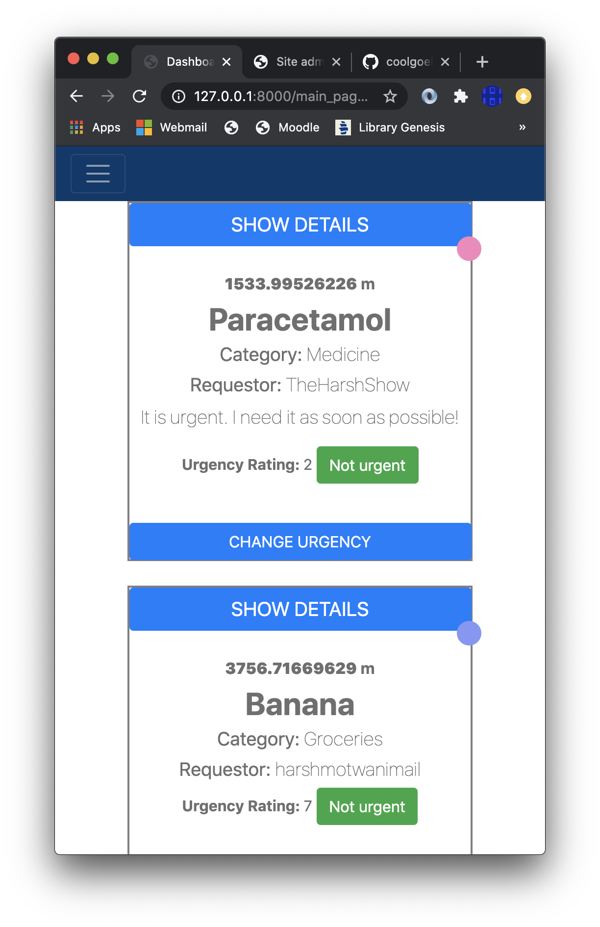 This was a project created by the Student Web Committee of IIT, Guwahati designed to help bridge the communication gap between the suppliers and the consumers during the COVID-19 lockdown in India. The project uses GeoDjango tools to find the requirements of nearby consumers (within a distance of five kilometers of users). The community can vote on the urgency of the requirements. The votes are essentially likes. The more votes a request has, the higher its urgency rating is. Finally there are the admins. The admins can view many requests in their area. The admins can also view the phone numbers of the users which are verified with a use of OTP verification.