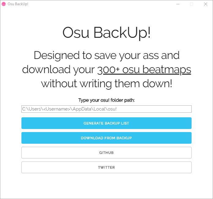 OsuBackUp is an app designed to backup and then download automatically all your osu! songs when needed. It uses Ripple server to download the beatmaps without limits.