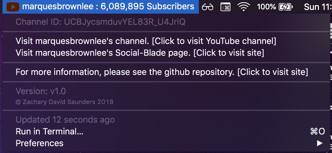 A MacOs Menu Bar (BitBar) plugin that displays your YouTube subscriber count (updated every minute).