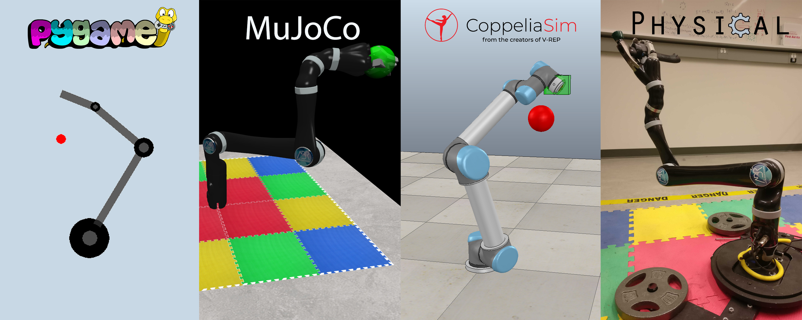 Mujoco, CoppeliaSim (formerly known as VREP), and Pygame simulation environments, and