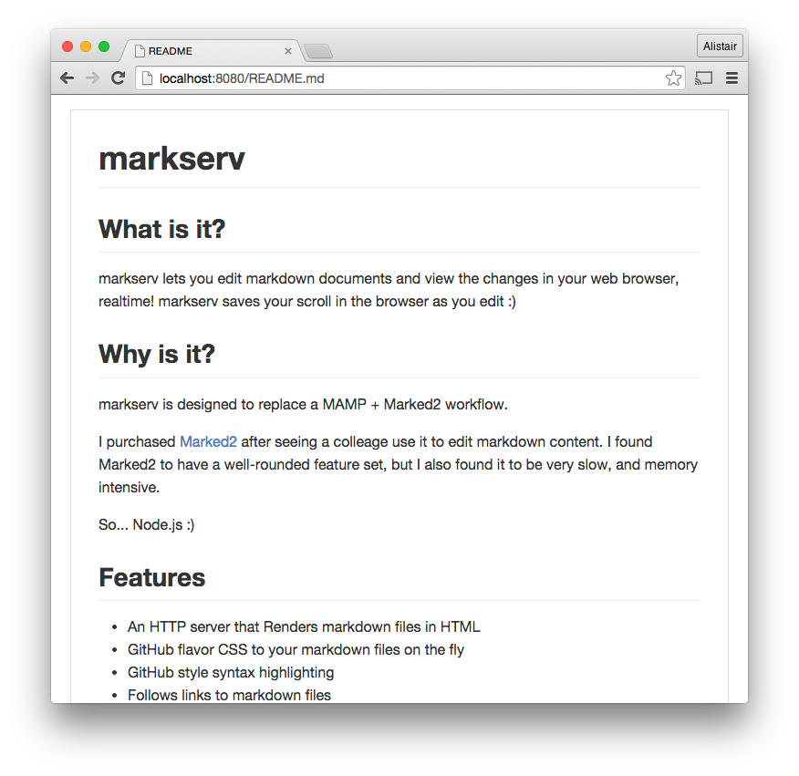 In the browser, click on a Markdown file, like "README.md", and markserv should render the Markdown file as HTML in your browser.