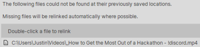 - You may notice an error that says The following files could not be found at their previously saved locations. Missing files will be relinked automatically where possible. If this pops up, simply double-click one of the files that shows up in the popup box, then go to the Images folder in the repository and select the corresponding image.This should fix the issue if it pops up.