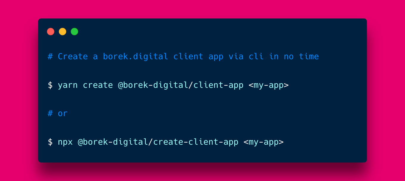 Create Client App Create a highly opinionated, but standardized borek.digital client app Getting started Make sure to have yarn (>= 1.10) installed yarn create @borek-digital/client-app <my-app> ...that's basically it - have fun 🤓 Contribute see some hints for local development of the template