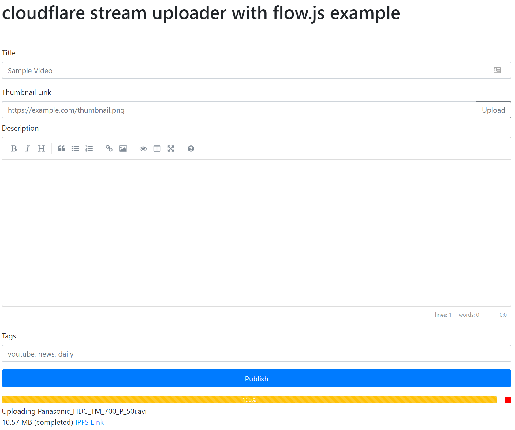 It comes with a little GUI that let users select a description, title, thumbnail etc and uploads a video through a proxy server to the cloudflare servers to not expose your CF API key. Videos are chunked through flow.js (as cloudflare accepts up to 100MB per file only) and rewritten on the server which acts as a proxy. Those videos are uploaded to Cloudflare which then will be encoded etc. It also tries to check whether videos already exists in your cloudflare account by running an SHA1 check with a custom hashing algorithm over the client side (browser) and then the same when it is uploaded to the server.