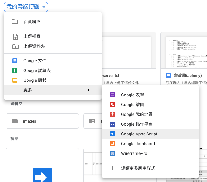由於 LINE Notify 無法直接透過「純」網頁前端的方式來發送訊息,所以必須在借重 Google Apps Script 簡易後端的能力來傳送通知,進入 Google 雲端硬碟,新增一個 Google Apps Script。