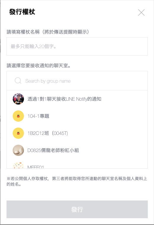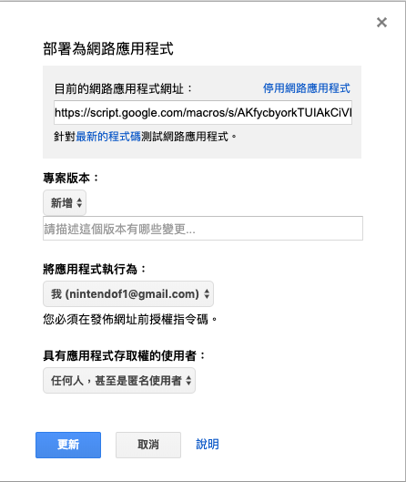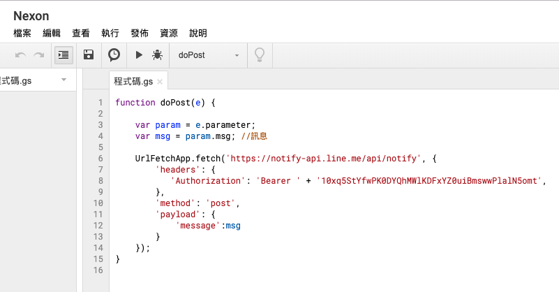 點選上方三角形的執行鈕,因為我們的 Apps Script 會連到外部服務,所以一開始會跳出存取權限的視窗,換句話說也就是同意外部服務使用你 Google 的帳號執行這個 Apps Script,這裡點選允許就行了。允許後,再點選一次上方三角形的執行鈕,應該就會收到 LINE Notify 發出的訊息囉。