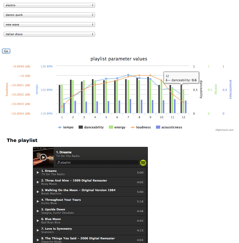 This web app will allow users to create playlists of songs by graphically sculpting how their parameters change over time. This is possible using the Echo Nest API, which allows access to quantitative musical data for tens of millions of songs. Using this database, Echo Nest provides methods for song suggestions that are constrained by numerous user-specified parameters like tempo, key, danceability, etc. Users will be able to click and drag lines on plots that describe how parameters used to suggest songs should change over time. For example, this could be used to create a 2 hour playlist in which tempo and danceability increase for 90 minutes followed by a 30 minute dropoff. A primary goal of this project has been to learn about Javascript, asyncronicity, HTML/CSS, data visualization and interactivity, web app frameworks, and other aspects of web programming.
