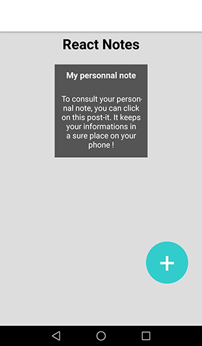 The first idea was to create an application that can allow the user to create multiple notes, accessible from the Home screen. To deliver the project on time we made a version with only one note for the user, because we had trouble dealing with multiple data using asyncStorage.