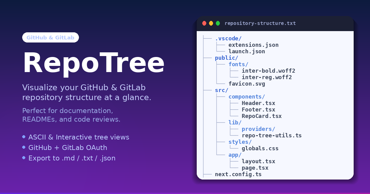 A web tool that visualizes GitHub and GitLab repositories with clean ASCII trees. Supports both public and private repositories via OAuth authentication.