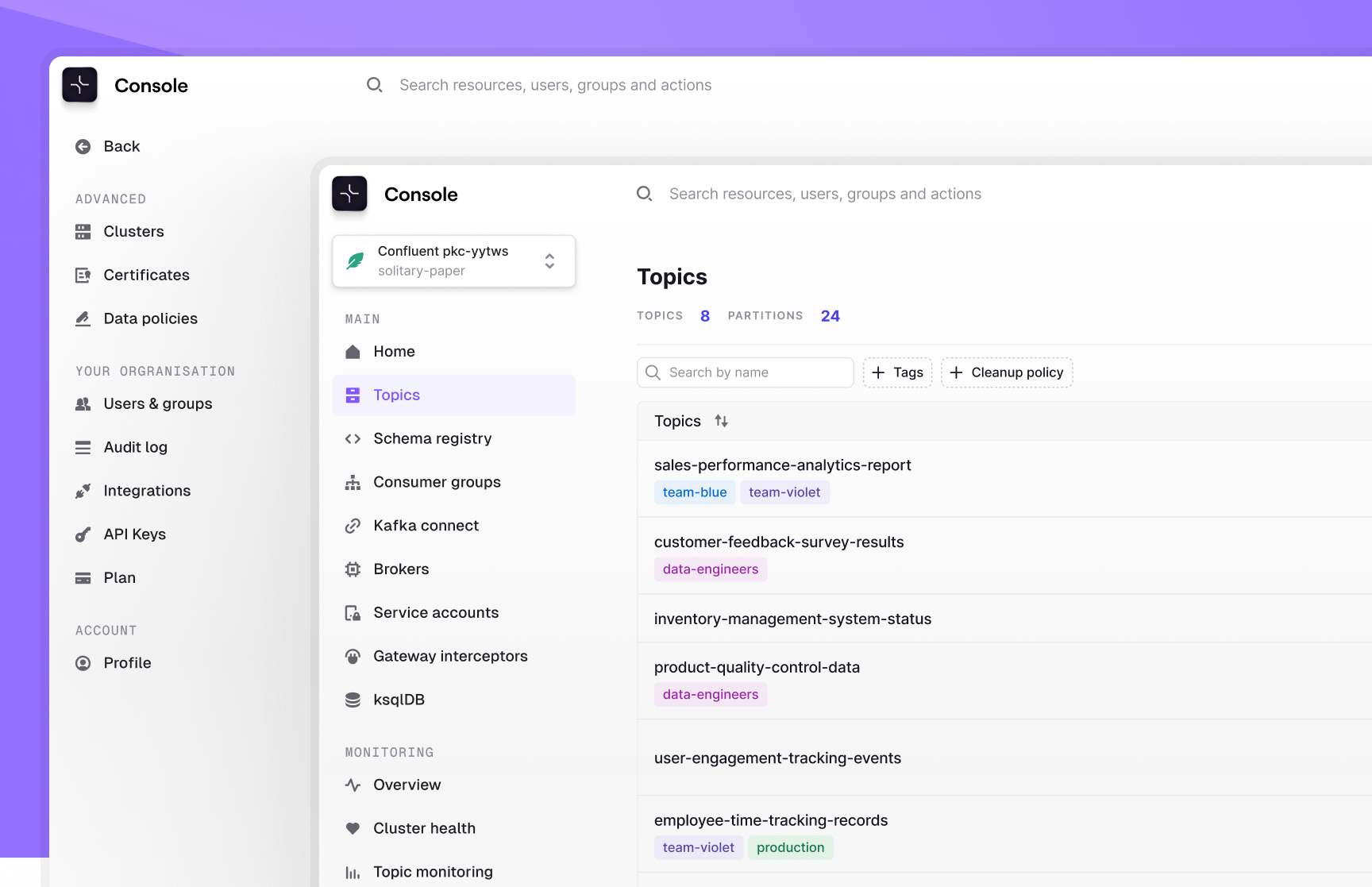 We take the complexity out of Kafka. Console gives you visibility into your Kafka ecosystem and concentrates all of the Kafka APIs into a single interface. Troubleshoot and debug Kafka, drill-down into topic data, and continuously monitor your streaming applications.