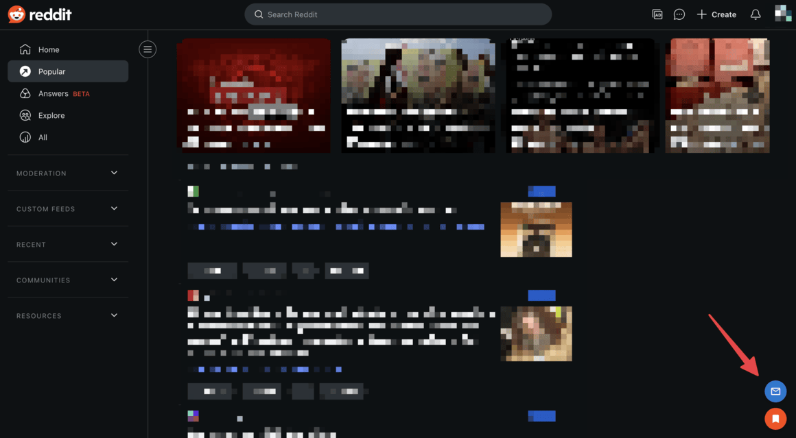 https://www.reddit.com/user/me/saved. - Messages Button: A blue button with a mail icon that links directly to