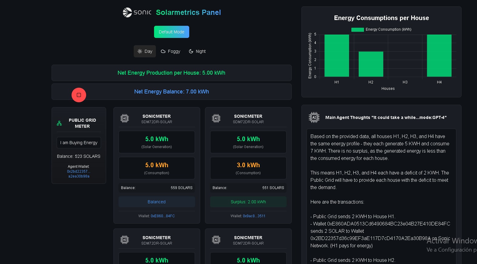 - Main Agent: The ZerePy-based AI agent receives raw data from simulated energy sensors, communicates with OpenAI's LLM, and makes optimal trading decisions. It determines whether households trade among themselves or interact with the public grid. Nebula AI is used to query on-chain data for real-time analytics.