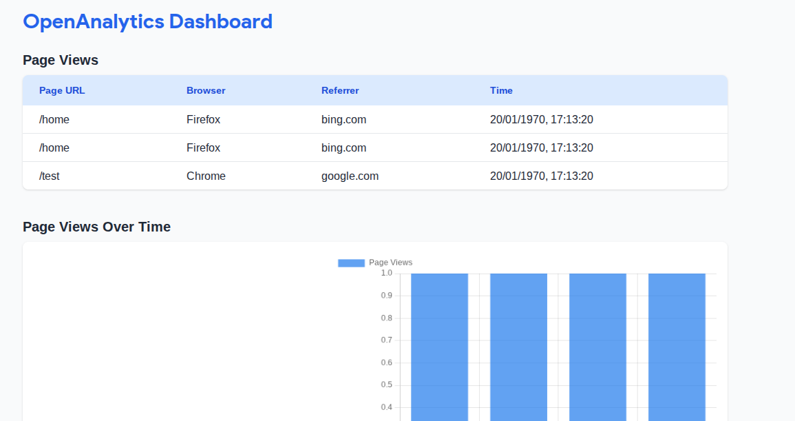 OpenAnalytics is a lightweight, self-hosted web analytics dashboard that tracks pageviews, browsers, referrers, and visit times. It’s easy to embed, complies with various privacy laws and provides visual insights via charts and tables.