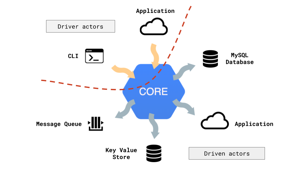 Actors are real world things that want to interact with the core. These things could be humans, databases or even other applications. Actors can be categorized into two groups, depending on who triggers the interaction: Drivers (or primary) actors, are those who trigger the communication with the core. They do so to invoke a specific service on the core. A human or a CLI (command line interface) are perfect examples of drivers actors. Driven (or secondary) actors, are those who are expecting the core to be the one who trigger the communication. In this case, is the core who needs something that the actor provides, so it sends a request to the actor and invoke a specific action on it. For example, if the core needs to save data into a MySQL database, then the core trigger the communication to execute an INSERT query on the MySQL client.