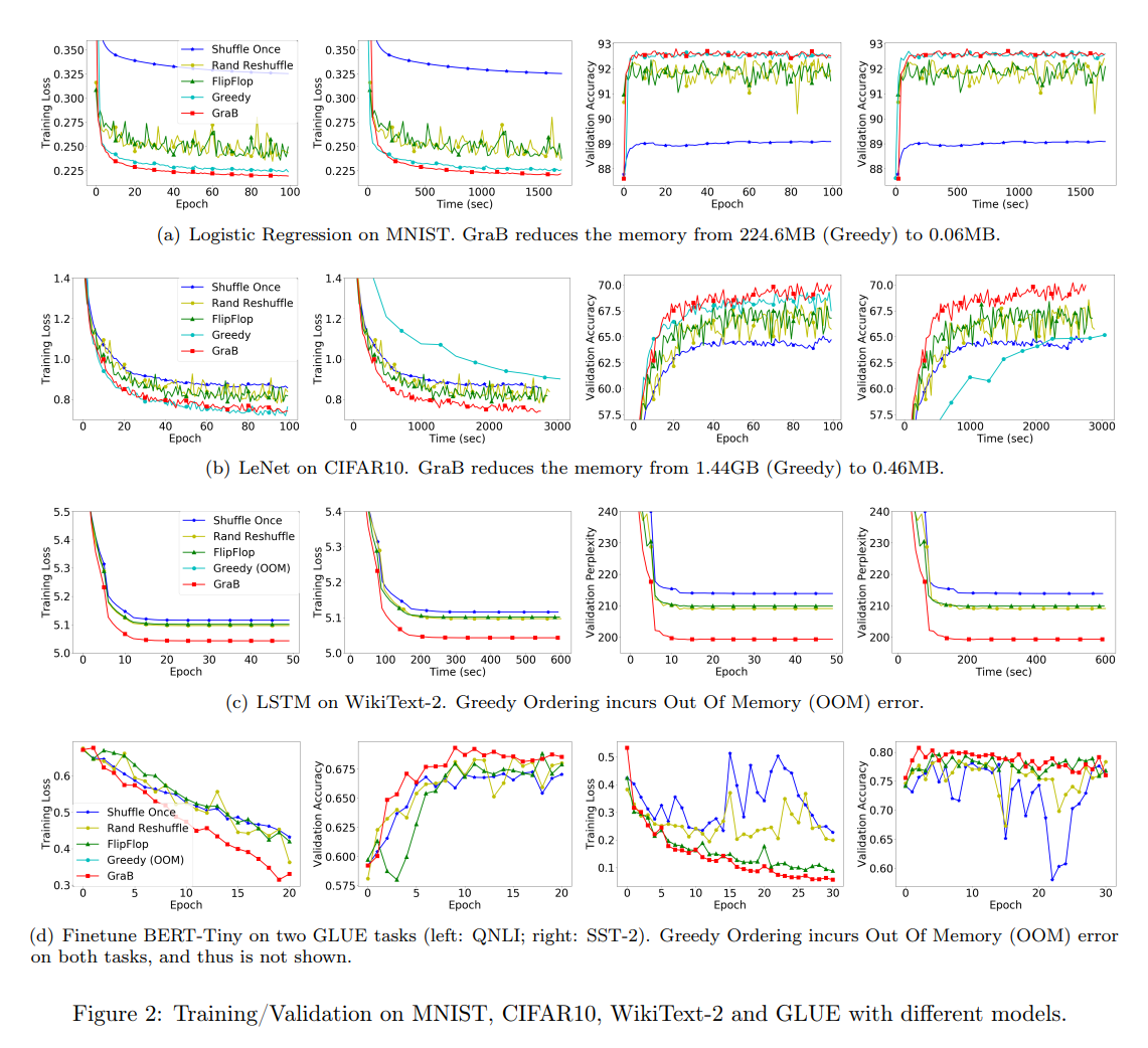 Proposed in the paper GraB: Finding Provably Better Data Permutations than Random Reshuffling, GraB (Gradient Balancing) is a data permutation algorithm that greedily choose data orderings depending on per-sample gradients to further speed up convergence of neural network training empirically. Recent paper Tighter Lower Bounds for Shuffling SGD: Random Permutations and Beyond shows that GraB provably achieves optimal convergence rate among arbitrary data permutations on SGD. Observation shows that not only does GraB allow fast minimization of the empirical risk, but also lets the model generalize better on multiple deep learning tasks.