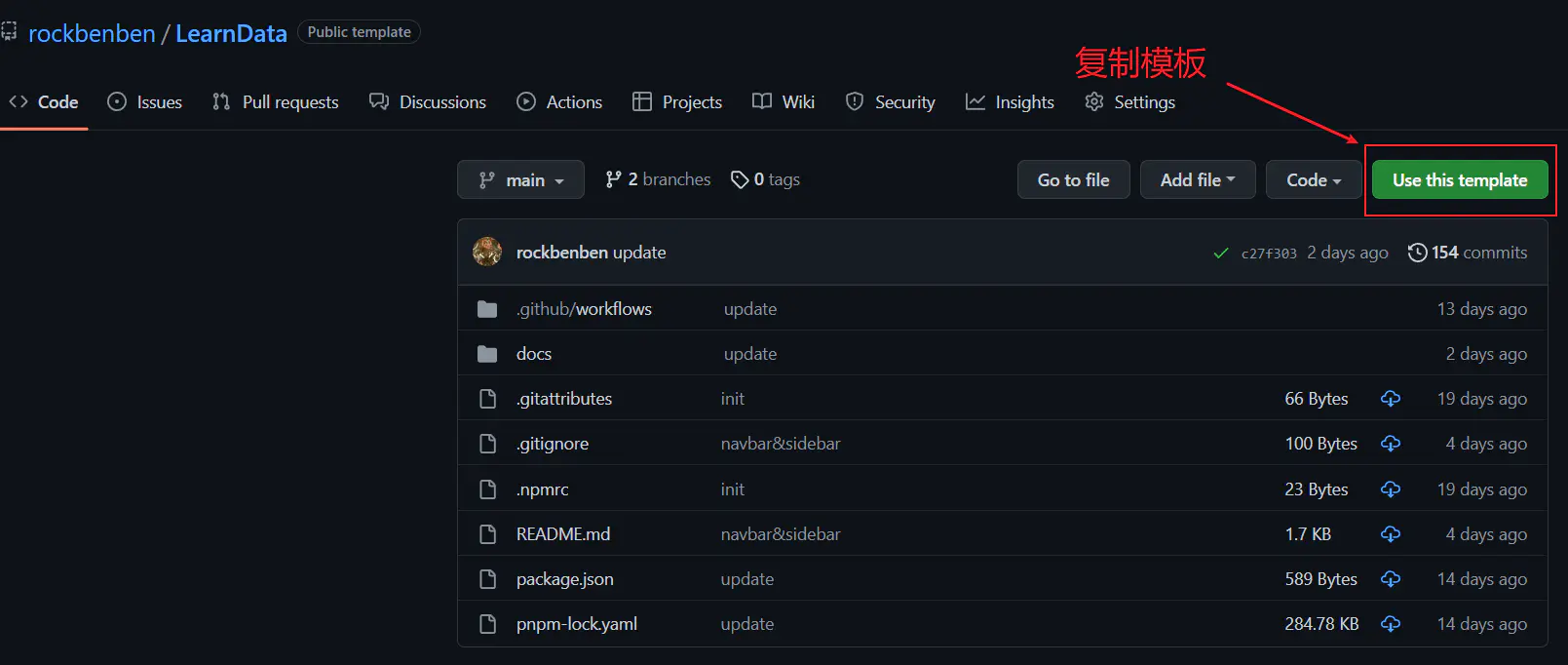 首先,进入 LearnData 项目页,点击右上方的「Use this template」>「Create a new repository」。