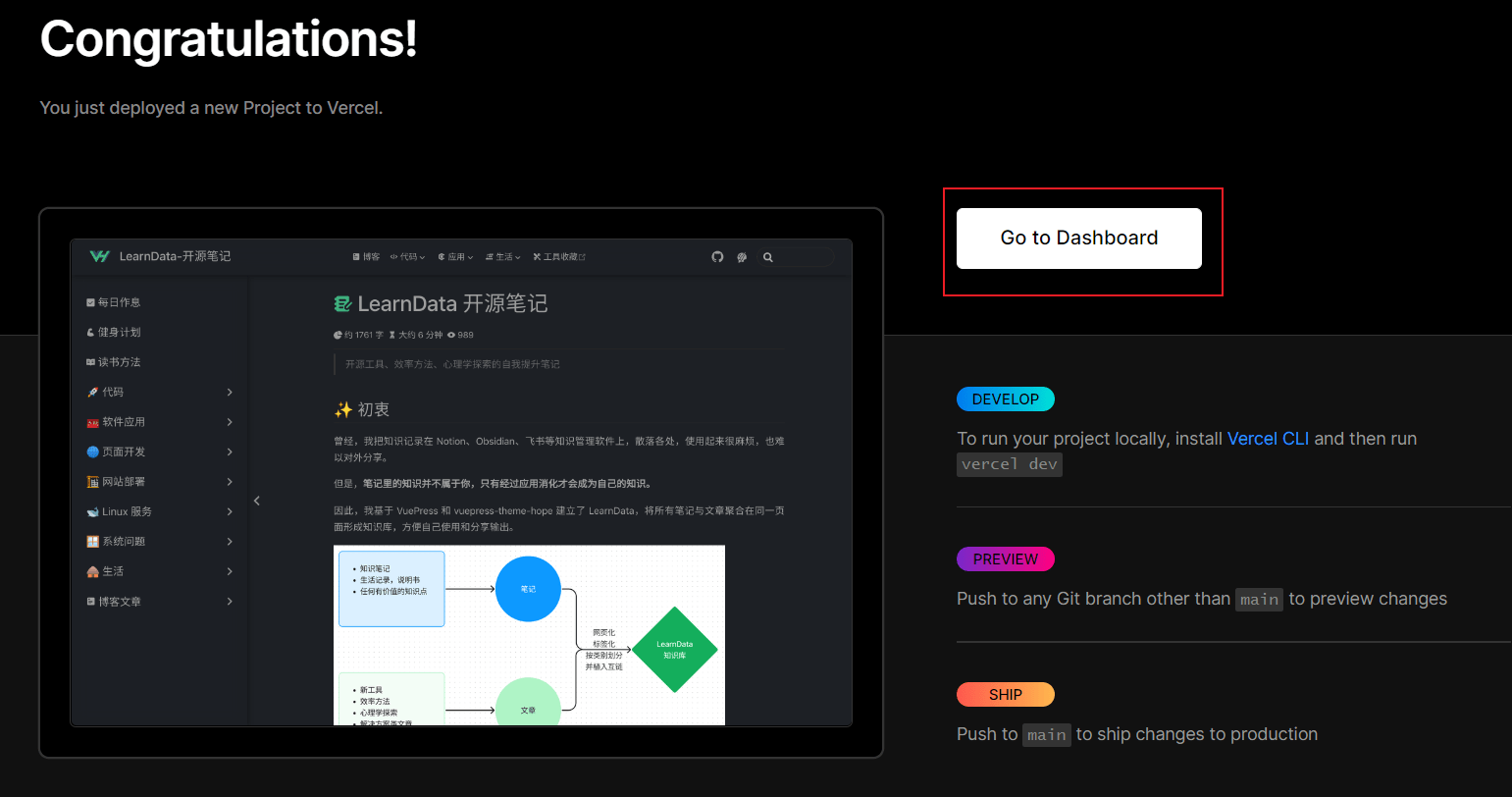 接着,Vercel 会基于 LearnData 模板帮助你新建并初始化仓库,仓库名为你之前输入的项目名。几十秒后,满屏的烟花会庆祝你部署成功。此时,点击