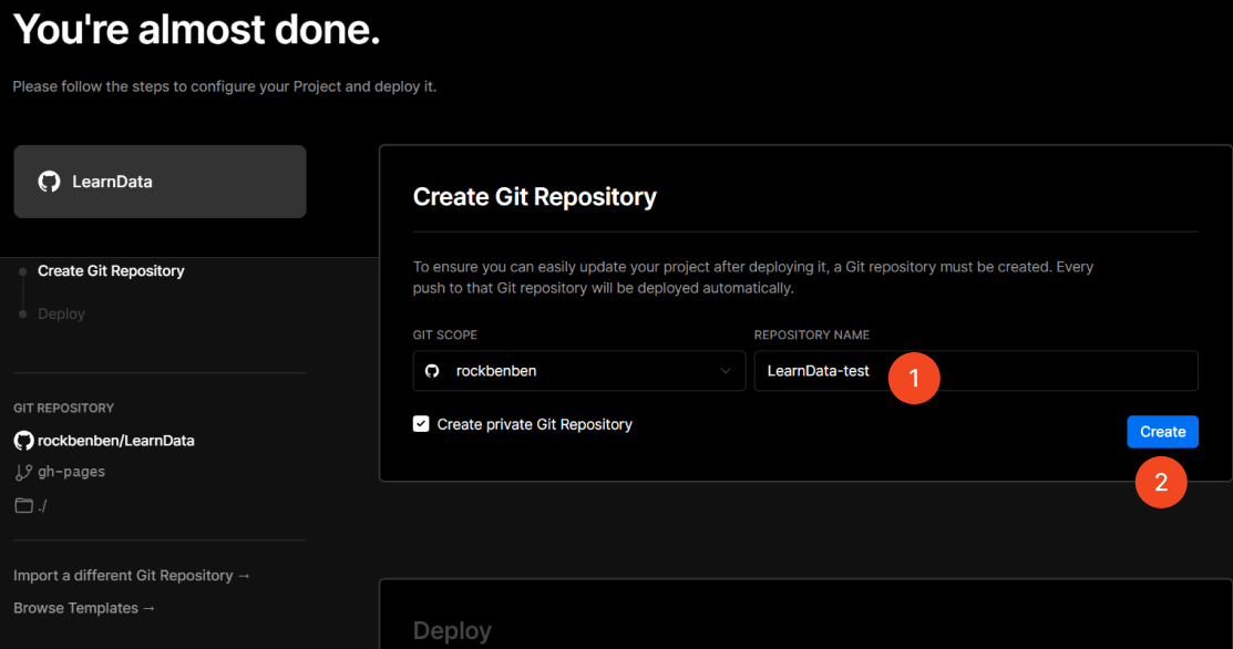 https://vercel.com/new/clone?repository-url=https://github.com/rockbenben/LearnData/tree/gh-pages中的rockbenben/LearnData改为你的用户名/仓库名,然后会跳转至 Vercel 进行网页部署。如果你未登录,Vercel 提示你注册或登录,请使用 GitHub 账户进行快捷登录。 -